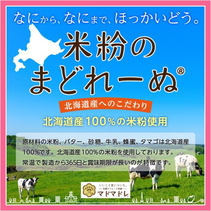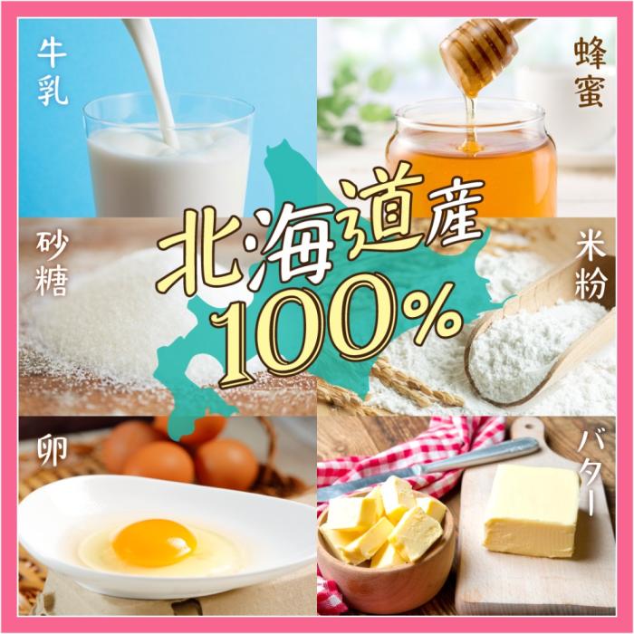 原材料の米粉は、北海道産100%の米粉を使用。いちご・バター・砂糖・牛乳・蜂蜜・タマゴも北海道産を100%使用し素材は北海道産にこだわっています。