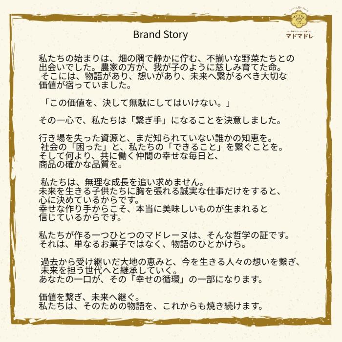 このマドレーヌは、農家の愛情、学生の情熱、そしてフードロス削減への願いが詰まった一品です。